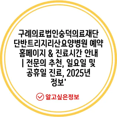 구례의료법인숭덕의료재단 단반트리지리산요양병원 예약 홈페이지 & 진료시간 안내 | 전문의 추천, 일요일 및 공휴일 진료, 2025년 정보’