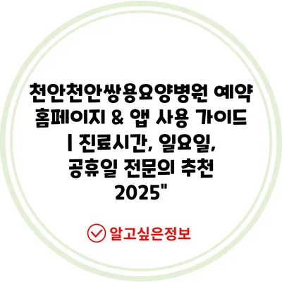 천안천안쌍용요양병원 예약 홈페이지 & 앱 사용 가이드 | 진료시간, 일요일, 공휴일 전문의 추천 2025″