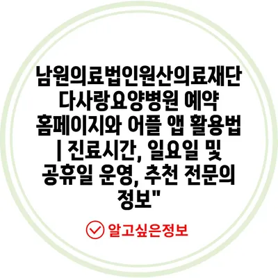 남원의료법인원산의료재단 다사랑요양병원 예약 홈페이지와 어플 앱 활용법 | 진료시간, 일요일 및 공휴일 운영, 추천 전문의 정보”