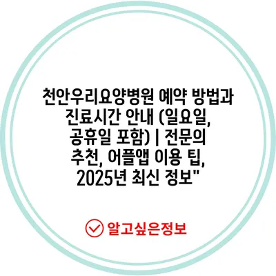 천안우리요양병원 예약 방법과 진료시간 안내 (일요일, 공휴일 포함) | 전문의 추천, 어플앱 이용 팁, 2025년 최신 정보”