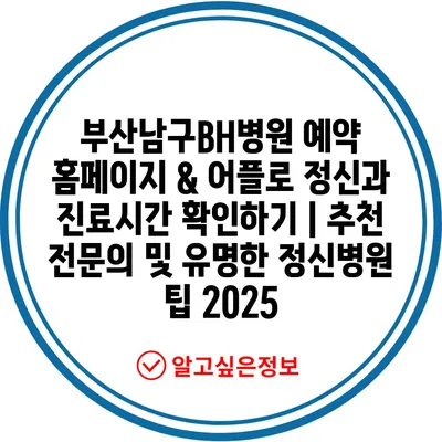 부산남구BH병원 예약 홈페이지 & 어플로 정신과 진료시간 확인하기 | 추천 전문의 및 유명한 정신병원 팁 2025